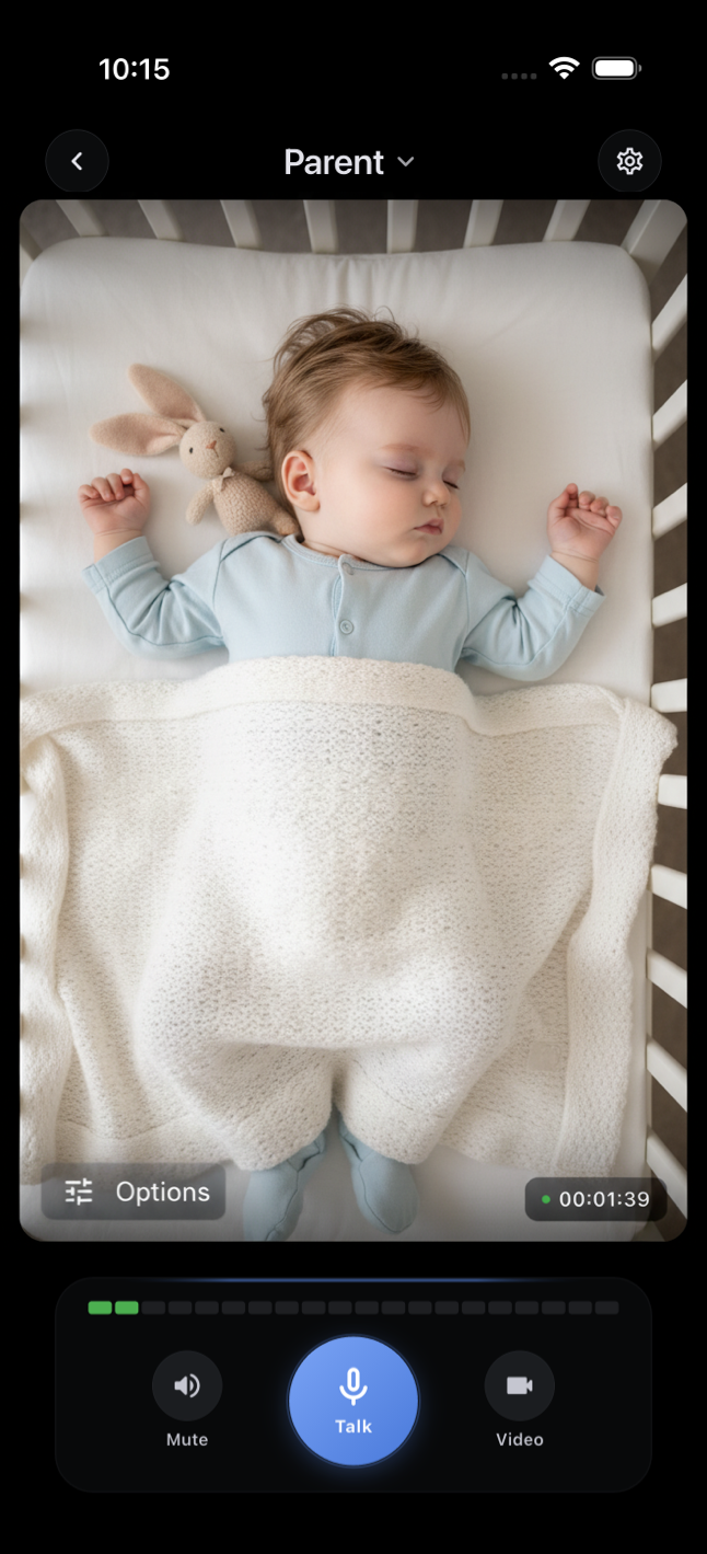 Built to keep your moments private. All video and audio stays on your local Wi-Fi network and is end-to-end encrypted. No data is sent to external servers — your baby monitor app is entirely yours.